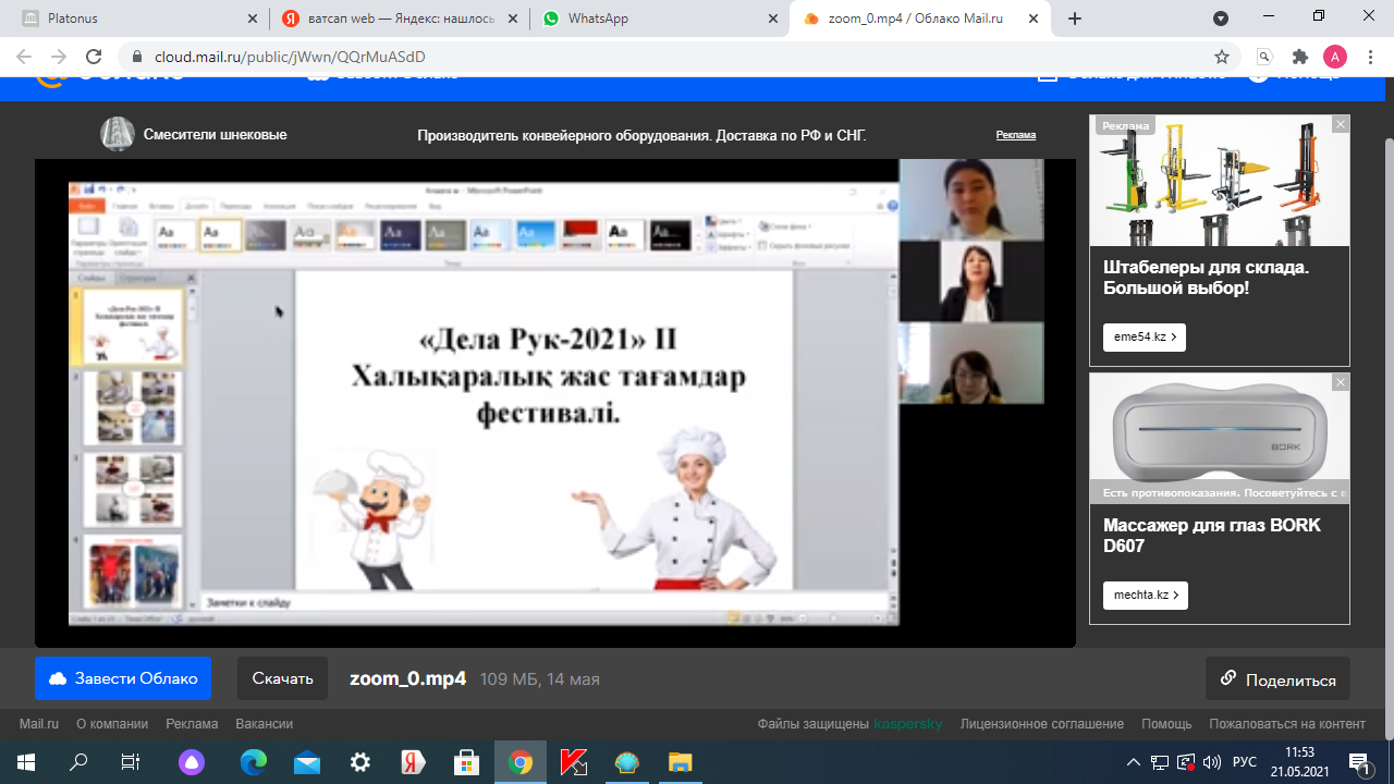 14.05.2021 года в колледже Сервиса и туризма акимата г. Нур-Султан в режиме онлайн состоялся семинар по итогам ІІ Международного фестиваля "Дело рук 2021" проходивший в г. Алматы. В ходе семинара преподаватели колледжа Байгабылова Гульден Е, Серикова К. Б, Махметова А. К и студенты Омарова Анастасия 2-Опк-319 группа, Мухтар Рузана Т-21, Алимхан Нурсултан ТУ-21 поделились своим опытом и впечатлениями от конкурса.